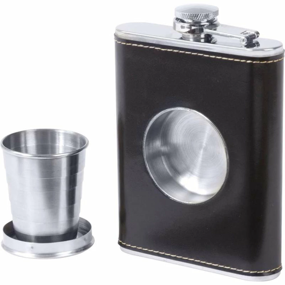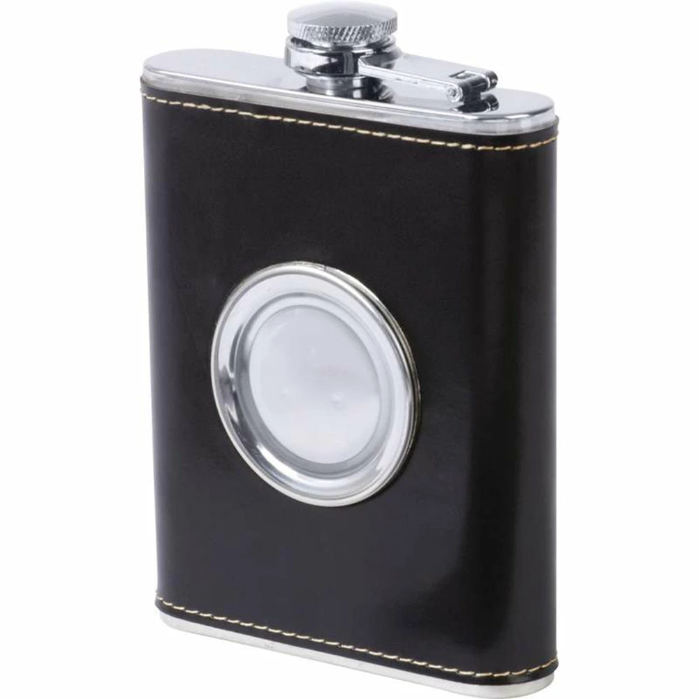 Features faux leather black wrap; polished finish top and bottom; and screw-down cap. Flask measures 3-3/4″ x 5-1/4″ x 1″; cup stands 2-1/4″ tall, 2″ in diameter.