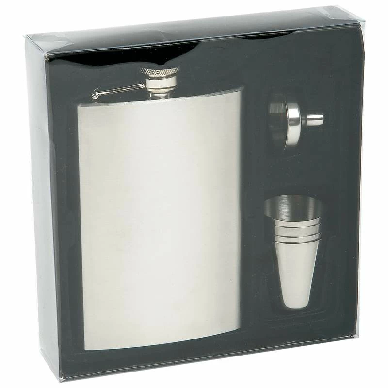 This set gets everyone in on the fun—it’s sure to be a big hit with friends and party guests. Includes 8oz flask, funnel and 4pc 1oz cups. All pieces are made of stainless steel with a brushed finish. Flask measures 3-5/8″ x 5-3/4″ x 1″. Gift boxed.