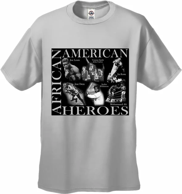 African American Sports Heroes T-Shirt. This detailed t-shirt features the likenesses of some of the most influential African American Athletes who talent and motivation change the sports world forever. Each of these African American athletes impacted the sport they played by showing the world they are competitors just like any other athlete in that field. This shirt feature Jim brown, Joe Louis, Jesse Owens, Jacki Robinson, Muhammad Ali, Tommy Smith & John Carlos. Each of these athletes played there part in the fight for freedom and unquestionably paved the way for equality as we know it today. It is said the action of these men gave the power to black rights activist such as martin luther king jr. and other civil liberation leaders that paved the path to Presidency for Barack Obama and other black leaders that are sure to follow in President Obama’s triumphant footsteps.