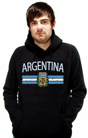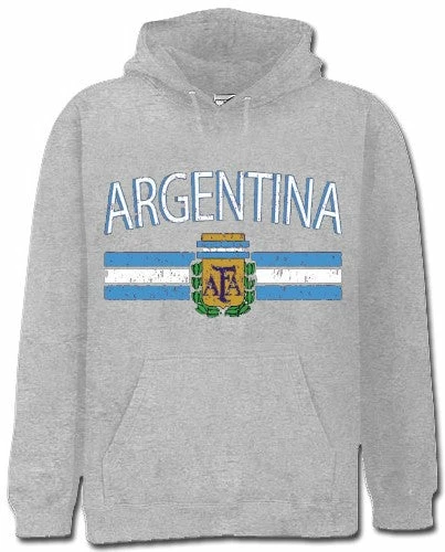 Argentina Vintage Flag International Hoodie. Show pride for your favorite Nation! Our collection of deluxe vintage international print Hoodies are the perfect way to support your home country. Each shirt features premium vintage style designs made to look distressed for that soft “Favorite Old Sweatshirt” look from day one. These shirts are perfect whether you are rooting for your favorite soccer nation or just showing your love for a special country. Bold athletic style writing spells out each country’s name curved above the country’s national shield; a classic design that is sure to display your patriotism! Each shirt is printed to order on a deluxe hooded sweatshirt in your choice of color.