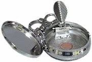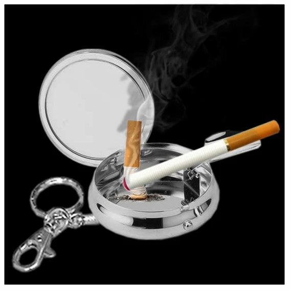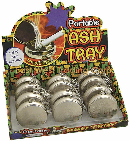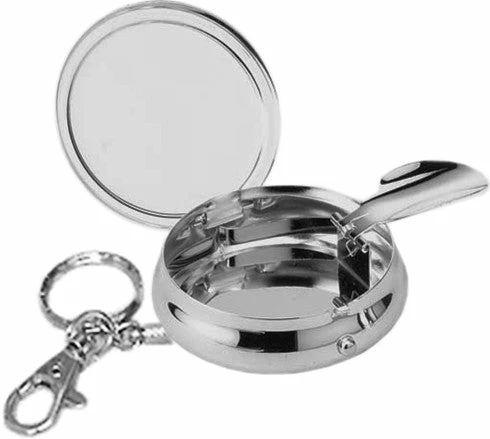 Now you can always have an ashtray with you wherever you go! This pocket sized ashtray stays shut until you need it. Just press the button and the spring-loaded top opens and a leaf comes out to rest your cigarette on. Perfect for all occasions. This mini ashtray is about the size of a half dollar. This ashtray also features a keyring and key chain clip so you can have it with you on the go wherever, whenever!