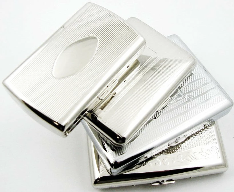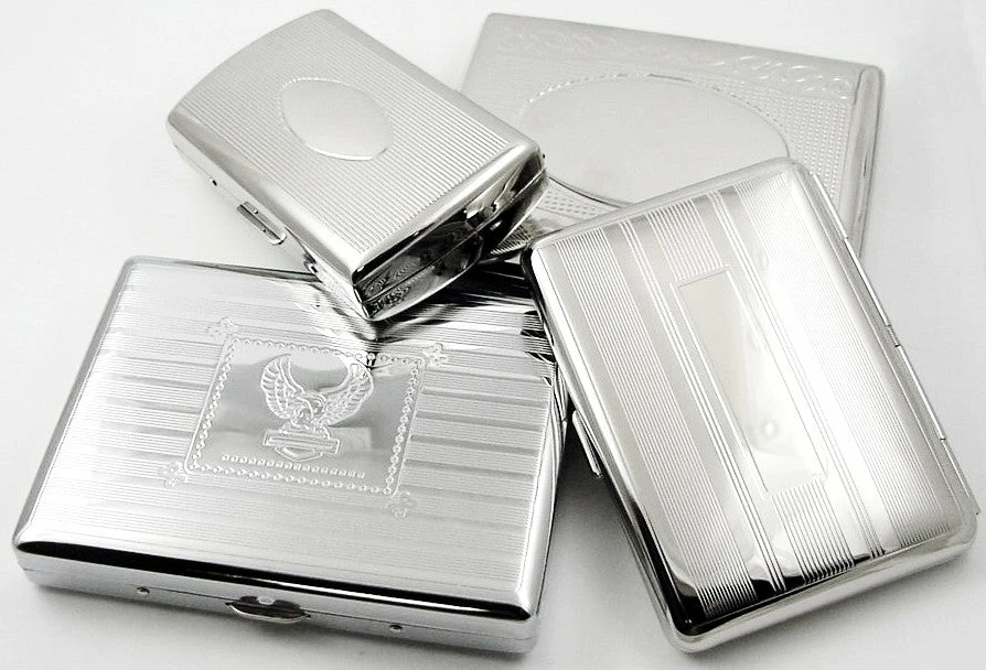 Change the appearance of your cruddy paper cigarette box with this hot new set of four cigarette cases. These cases can hold up to a full pack of your favorite brand of smokes. The spring loaded hatches allows for easy opening and is secure when closed. With strong pin arms, allow your cigarettes stay in place when in the case and will not move or be damaged. This 4 pack of cigarette cases ship in assorted styles made up of 4 our best selling cigarette cases that you are sure to love. Cigarette cases pictured will not necessarily be the one you receive.