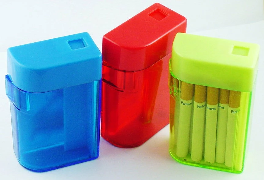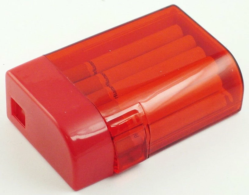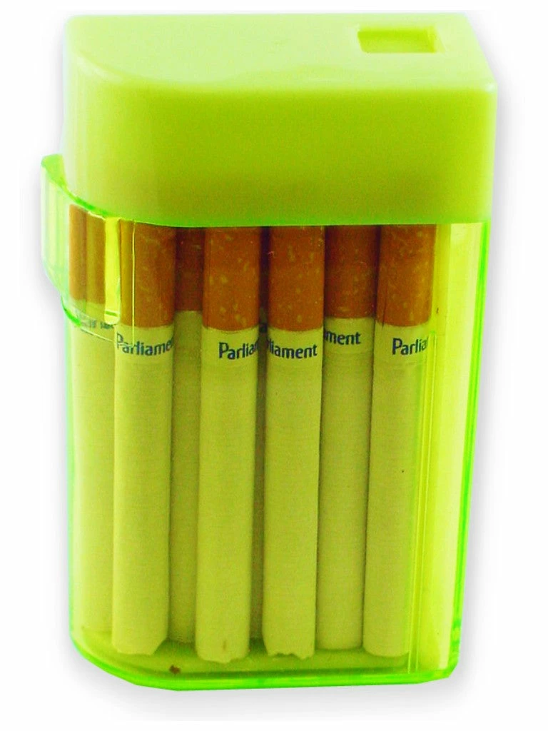 You have never seen anything like this unique cigarette case! This Cigarette case automatically dispenses a cigarette with the push of a button. Load your cigarettes into the dispenser and you are ready to go. The simple yet ingenious mechanics of this dispenser automatically load the cigarette, open a dispenser door and they ejects a cigarette out popping it straight into your hand or even directly into your mouth! This novel cigarette dispenser will have every one who sees it asking you how it works and they will definitely want to know where you bought it. There is no other product in the world that does what this cigarette dispenser does. The coolest feature of the cigarette dispenser is that it is made out of transparent acrylic, so you can see all of the mechanics in action as they work to pop out your cigarette with the push of a button. Your cigarette can either just pop out slowly or shoot out like a rocket depending on how fast or hard you operate the button. Ships in assorted colors.