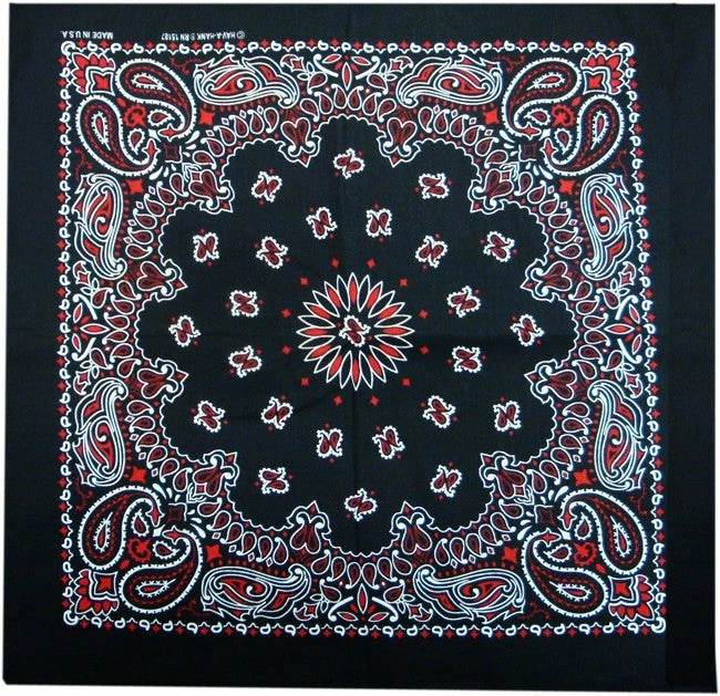 Bandanas – Black & Red Paisley Bandanna. Bandanas are a very unique and versatile accessory that can be worn as a wrap or head band, can be tied around your wrist as an accent piece or can be used on your dining room table as stylish dinner napkins. There are millions of uses for a bandanna, whether you are wearing it as an accent to your outfit or tying it around your dogs collar to give rover a cute touch you are sure to find tons of great ways to use your bandana. Here at bewild.com we offer a huge selection of premium quality bandanas is dozens of colors, styles, paterns and designs. Each 100% cotton bandana measures 22″ x 22″, the perfect size to tie around your head. Perfect for bad hair days!