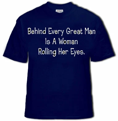 Behind Every Great Man Is A Woman Rolling Her Eyes Men’s T-Shirt. Exclusively from Bewild.com, these new Tee’s feature hard-core sayings that say it all. From “Lick Here For Full View” to “Skanky white-trailer trash”. How about a hoodie that says “Behind Every Great Man Is A Woman Rolling Her Eyes?” Our short sleeve “Behind Every Great Man Is A Woman Rolling Her Eyes ” t-shirts are made from a 100% fully machine washable cotton/poly blend for a comfortable fit every time.