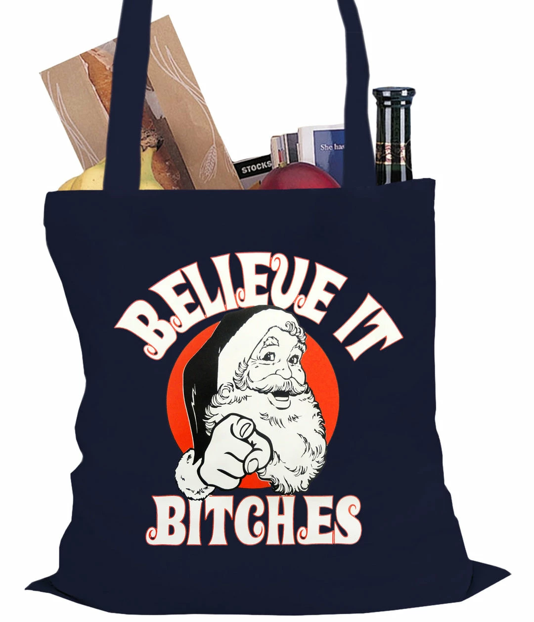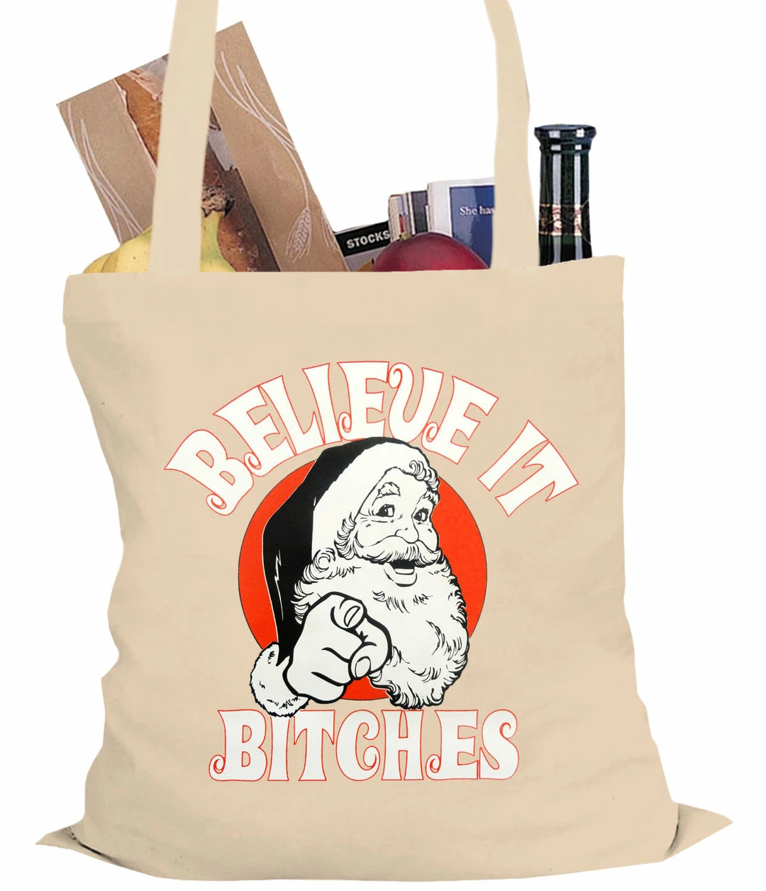 Bewild Believe B*tches Funny Santa Tote Bag Holiday Prints