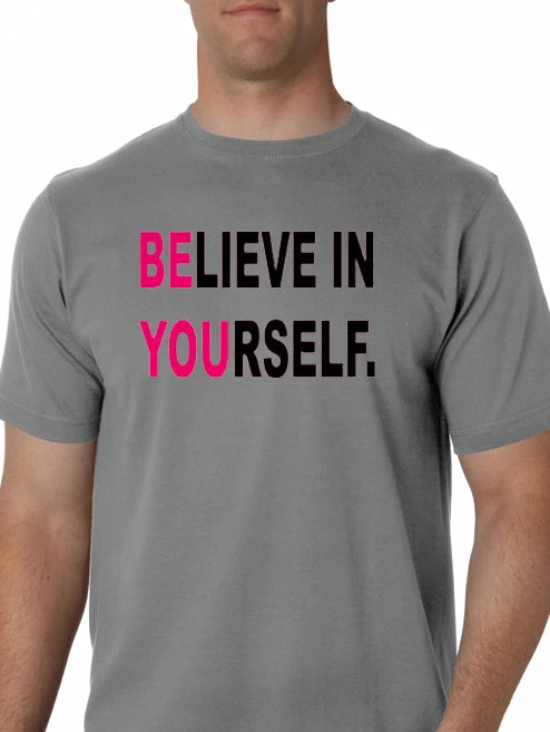 These Believe In Yourself Men’s T-Shirt have been printed with image on the front. These Believe In Yourself t shirts are made from heavyweight 6oz. 100% Preshrunk cotton. Believe In Yourself Men’s T-Shirt features a classic 100% Cotton style. Looks Great, Priced right – and gets better with each washing Preshrunk 100% cotton jersey 6-oz. Seamless double-needle 7/8″ collar Taped neck and shoulders Double-needle sleeve and bottom hems Quarter-turned to eliminate center crease