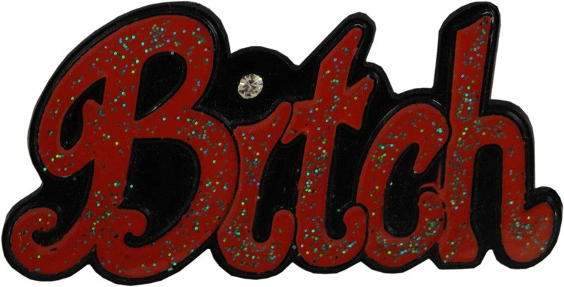 The Bitch Rhinestone Belt Buckle is beautifully crafted in Italy and features a dark black wash that and red enamel text with embedded glitter to add depth to this detailed buckle. This buckle makes a great accent to you favorite outfit! Great for guys and girls alike! Fits most universal buckles. Makes a great gift!