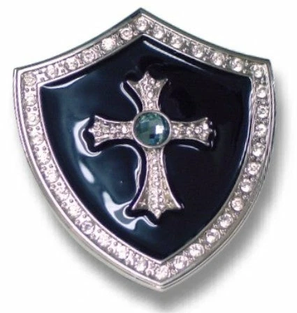 Protect yourself, mind, body and soul with this excaliber shield outlined in beautiful glistening rhinestones. Shield depicts a mediaeval cross with a gemstone in the center. Thought to bring eternal life to all knights which bear its glory. Enamel is flawlessly poured into the bed of the shield with a dazzling chrome finish. Shield belt buckle fits all universal belts and measures 3 ½’’ W X 4 ½’’ L.
