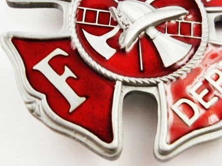 The Fire Dept. Belt Buckle belt buckle is beautifully crafted and is finished in subtle pewter and features intricate red enamel accents. This buckle makes a great accent to you favorite outfit! Great for guys and girls alike! Fits most universal buckles. Makes a great gift!
