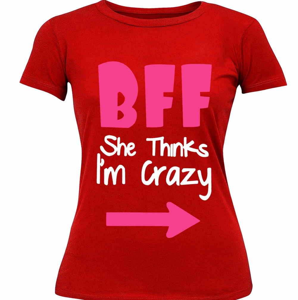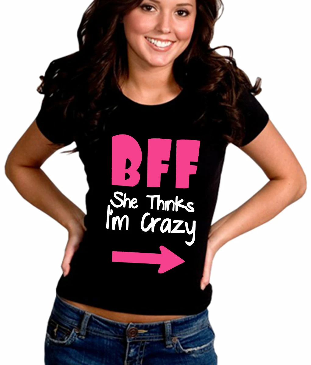 BFF – She Thinks I’m Crazy Junior Fitted shirts are a S-32″ at bust and 29″ at waist, M-34″ at bust and 30″ at waist , L36″ at bust and 34″ at waist, XL-38″ at bust and 35″ at waist.