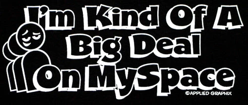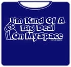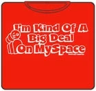 Big Deal On Myspace T-Shirt. Exclusively from Bewild.com, these new tee’s feature hard-core sayings that say it all. From “Lick Here For Full View” to “Skanky white-trailer trash”. How about a t-shirt that says “Dip me in Chocolate and throw me to the lesbians?” Our short sleeve “Big Deal On Myspace” t-shirts are made from a 100% fully machine washable preshrunk cotton for a cool and comfortable fit every time.