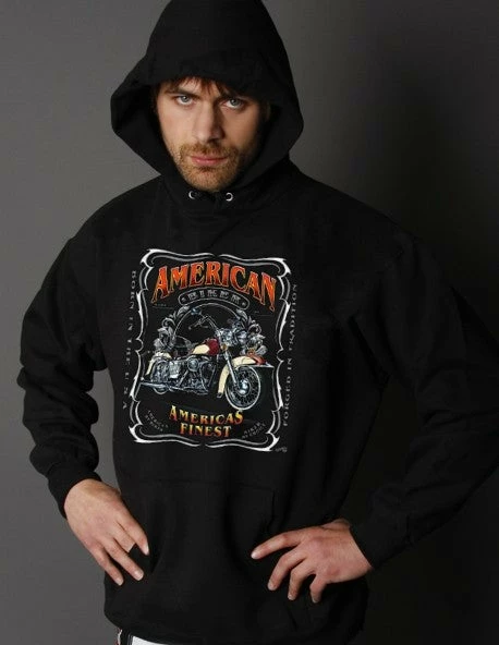Biker Hoodies – “Forged in Tradition” Biker Hoodie. Look No Further, you have found on of the most Bad Ass Biker sweat shirts on the web. As a biker, you take pride in all you stand for, and now this exclusive line of Biker hoodies lets you wear whats on your mind. Forget prim and proper, these sweat shirts are blacked out and feature big, bold biker sayings on them. These hoodies look great beneath a leather vest, with a pair of your favorite jeans and those ol faithful boots that haven’t let you down in years. Every biker hoodie is available on any color hoodie you want…. as long as the color you want is black.