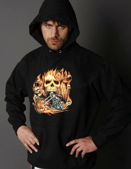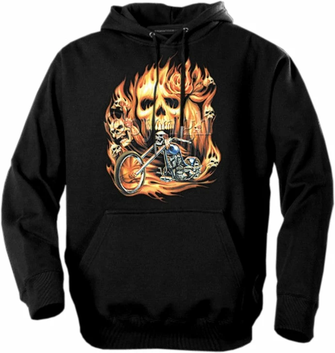 Biker Hoodies – “Rider From Hell” Biker Hoodie. Look No Further, you have found on of the most Bad Ass Biker sweat shirts on the web. As a biker, you take pride in all you stand for, and now this exclusive line of Biker hoodies lets you wear whats on your mind. Forget prim and proper, these sweat shirts are blacked out and feature big, bold biker sayings on them. These hoodies look great beneath a leather vest, with a pair of your favorite jeans and those ol faithful boots that haven’t let you down in years. Every biker hoodie is available on any color hoodie you want…. as long as the color you want is black.