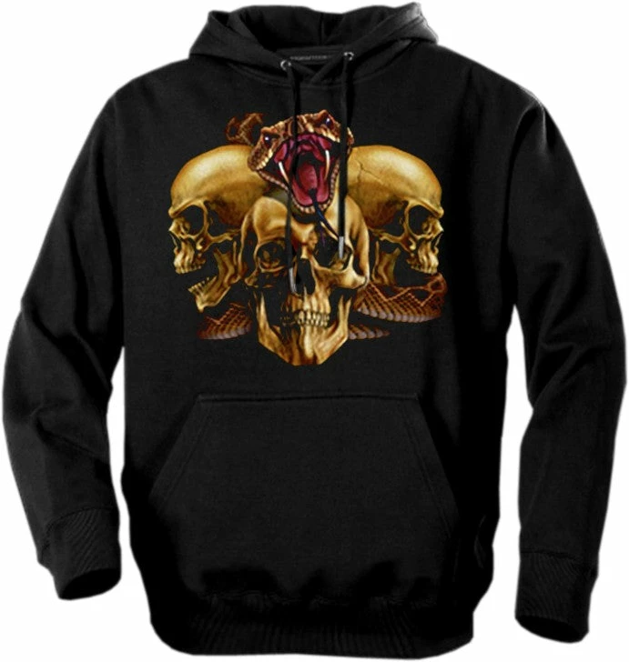 Biker Hoodies – “Slither Skulls” Biker Hoodie. Look No Further, you have found on of the most Bad Ass Biker sweat shirts on the web. As a biker, you take pride in all you stand for, and now this exclusive line of Biker hoodies lets you wear whats on your mind. Forget prim and proper, these sweat shirts are blacked out and feature big, bold biker sayings on them. These hoodies look great beneath a leather vest, with a pair of your favorite jeans and those ol faithful boots that haven’t let you down in years. Every biker hoodie is available on any color hoodie you want…. as long as the color you want is black.