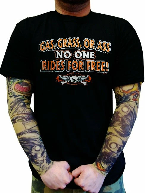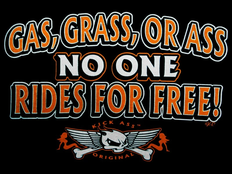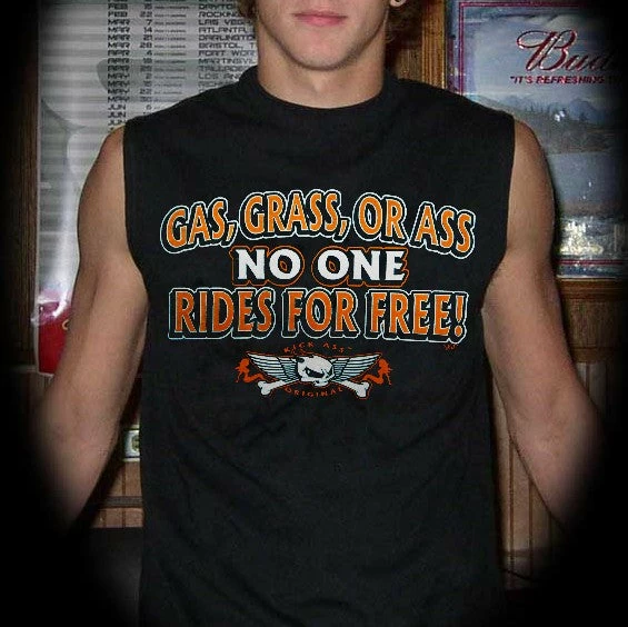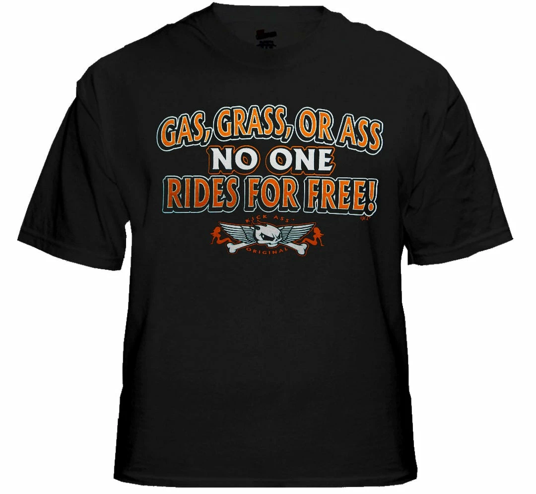 Biker Shirts – “Gas Grass or Ass Trucker Babe” Biker Shirt. Look No Further, you have found on of the most Bad Ass Biker Shirts on the web. As a biker, you take pride in all you stand for, and now this exclusive line of Biker shirts lets you wear whats on your mind. Forget prim and proper, these shirts are blacked out and feature big, bold biker sayings on them. These tees look great beneath a leather vest, with a pair of your favorite jeans and those ol faithful boots that haven’t let you down in years. Each print come on your choice of a standard black Mens T-shirt or the classic sleeveless biker tee.