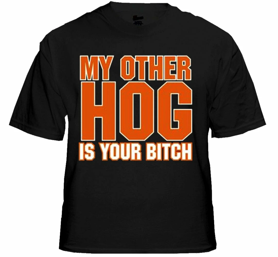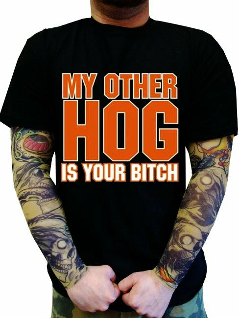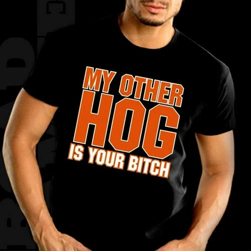Biker Shirts – “My Other Hog” Biker Shirt. Look No Further, you have found on of the most Bad Ass Biker Shirts on the web. As a biker, you take pride in all you stand for, and now this exclusive line of Biker shirts lets you wear whats on your mind. Forget prim and proper, these shirts are blacked out and feature big, bold biker sayings on them. These tees look great beneath a leather vest, with a pair of your favorite jeans and those ol faithful boots that haven’t let you down in years. Each print come on your choice of a standard black Mens T-shirt or the classic sleeveless biker tee.