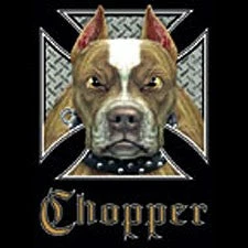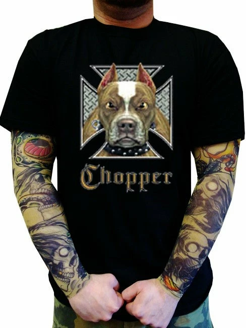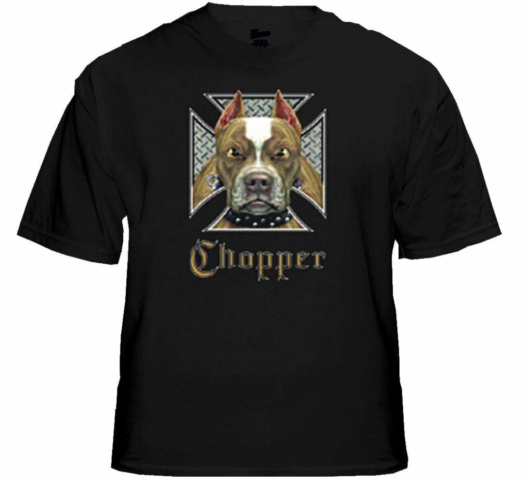 Biker Shirts – “Pit Bull Chopper” Biker Shirt. Look No Further, you have found on of the most Bad Ass Biker Shirts on the web. As a biker, you take pride in all you stand for, and now this exclusive line of Biker shirts lets you wear whats on your mind. Forget prim and proper, these shirts are blacked out and feature big, bold biker sayings on them. These tees look great beneath a leather vest, with a pair of your favorite jeans and those ol faithful boots that haven’t let you down in years. Each print come on your choice of a standard black Mens T-shirt or the classic sleeveless biker tee.