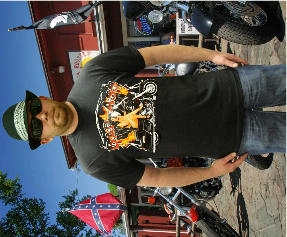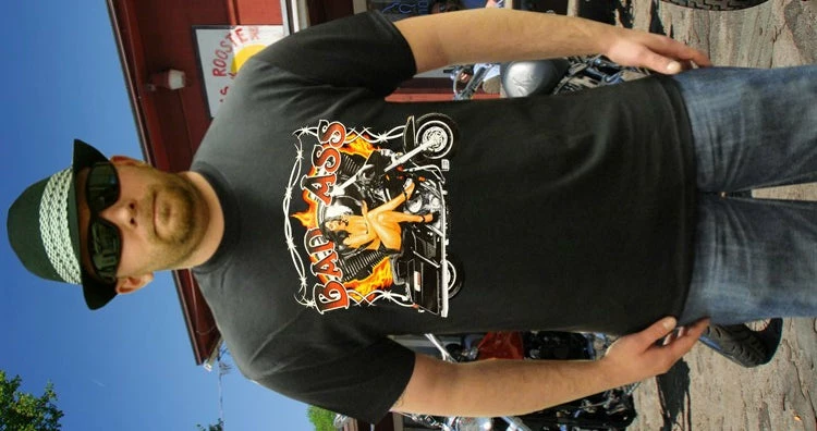 Look No Further, you have found on of the most Bad Ass Biker Shirts on the web. As a biker, you take pride in all you stand for, and now this exclusive line of Biker shirts lets you wear whats on your mind. Forget prim and proper, these shirts are blacked out and feature big, bold biker sayings on them. These tees look great beneath a leather vest, with a pair of your favorite jeans and those ol faithful boots that haven’t let you down in years. Each print come on your choice of a standard black Mens T-shirt or the classic sleeveless biker tee.