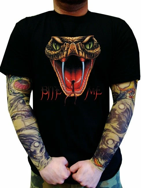 Biker T-Shirts – “Bite Me Fangs” Biker Shirt. Look No Further, you have found on of the most Bad Ass Biker Shirts on the web. As a biker, you take pride in all you stand for, and now this exclusive line of Biker shirts lets you wear whats on your mind. Forget prim and proper, these shirts are blacked out and feature big, bold biker sayings on them. These tees look great beneath a leather vest, with a pair of your favorite jeans and those ol faithful boots that haven’t let you down in years. Each print come on your choice of a standard black Mens T-shirt or the classic sleeveless biker tee.
