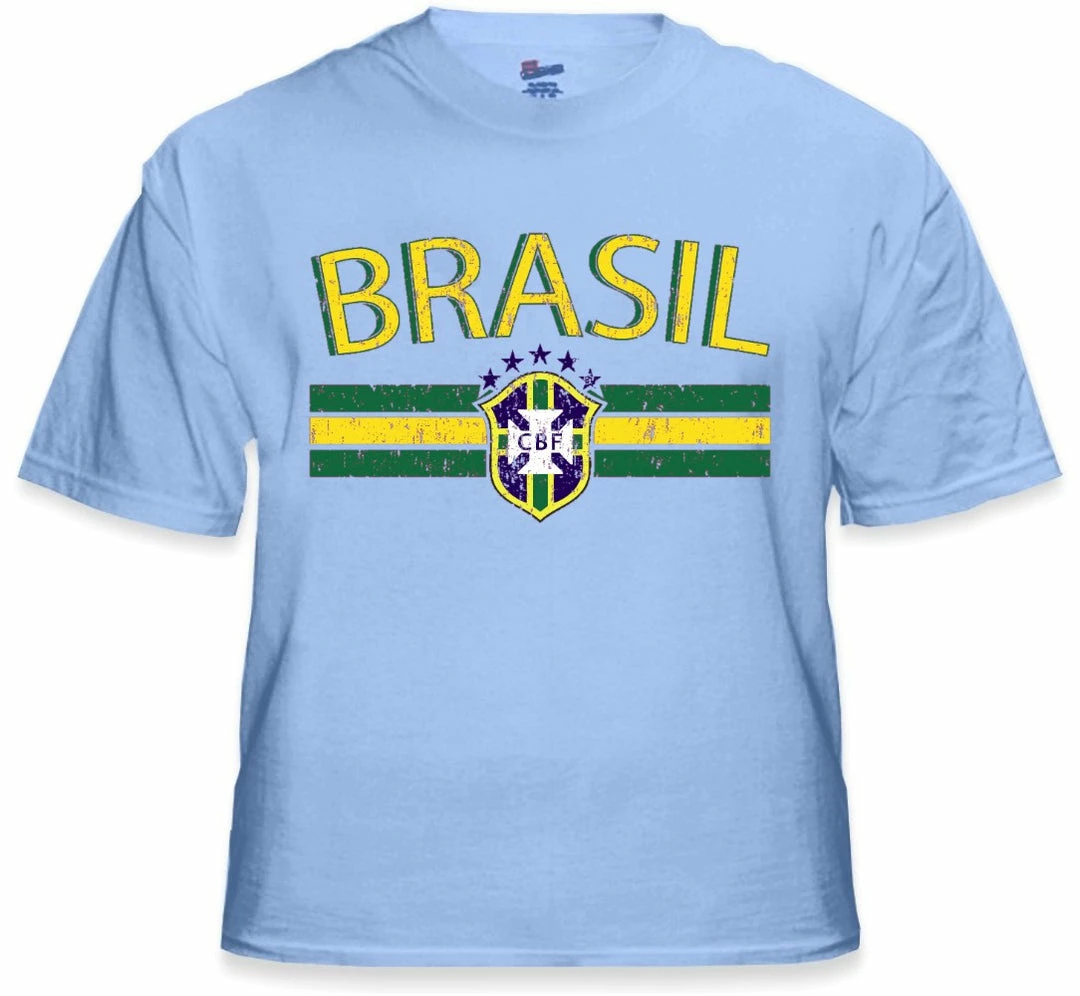 Brasil Vintage Shield International Mens T-Shirt. Show pride for your favorite Nation! Our collection of deluxe vintage international print t-shirts are the perfect way to support your home country. Each shirt features premium vintage style designs made to look distressed for that soft “Favorite Old T-shirt” look from day one. These shirts are perfect whether you are rooting for your favorite soccer nation or just showing your love for a special country. Bold athletic style writing spells out each country’s name curved above the country’s national shield; a classic design that is sure to display your patriotism! Each shirt is printed to order on a deluxe Cotton tee shirt in your choice of color.
