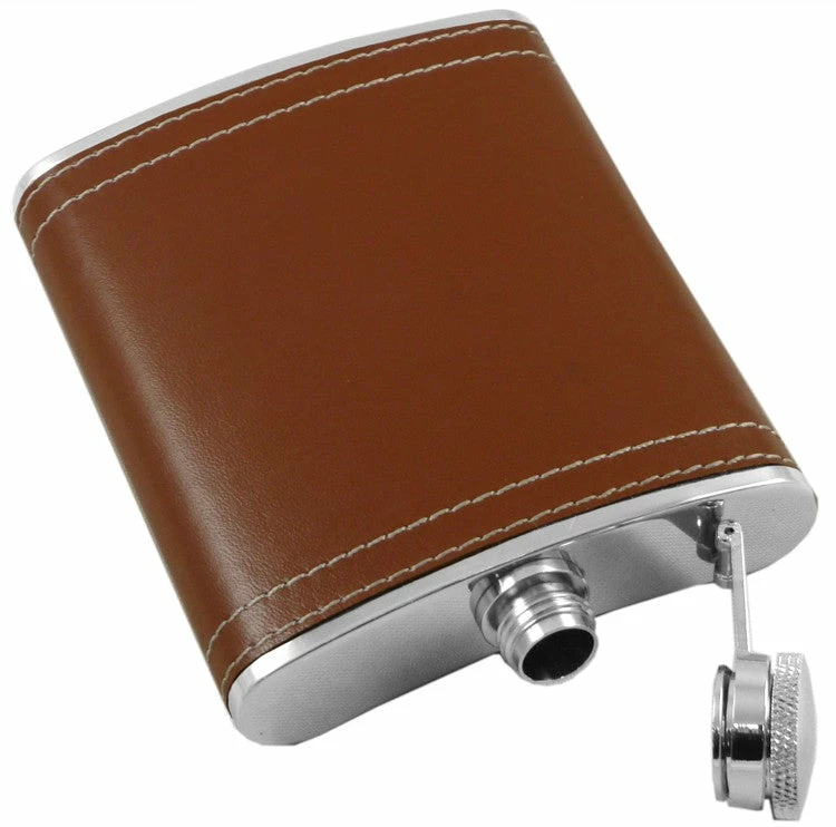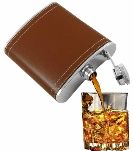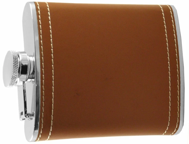 Brown Leather Wrap Hip Flask. The Accent Stitched pocket flask is made of 100% stainless steel and is finished with professionally fitted brown leather sheathing with white stitched accents. This flask will hole up to 6 fl oz. of your favorite adult beverage, that’s 5 big shots ready to mix or drink straight! The comfortable contour makes this flask comfortable while in your pocket and fits flush to your thigh for low profile appearance even when you are seated. A Leak proof screw on cap keeps your contents from spilling and it is attached to the flask so it’s not going any where! Why pay high liquor prices at your favorite restaurants and events? A cocktail at a club or ball game can go for more then $10! Make the same cocktail yourself for a fraction of the price, the flask will pay for itself by the first use!