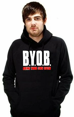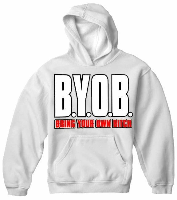 BYOB Bring Your Own Bitch Hoodie. Bring your own beer? NO. Bring Your Own Bitch!!! This shirt says it all and is a must have for all party animals. This sweet novelty t-shirt is sure to get some giggles when you wear it. People are sure to notice!!! This shirt is 100% cotton and the design gets straight to the point.