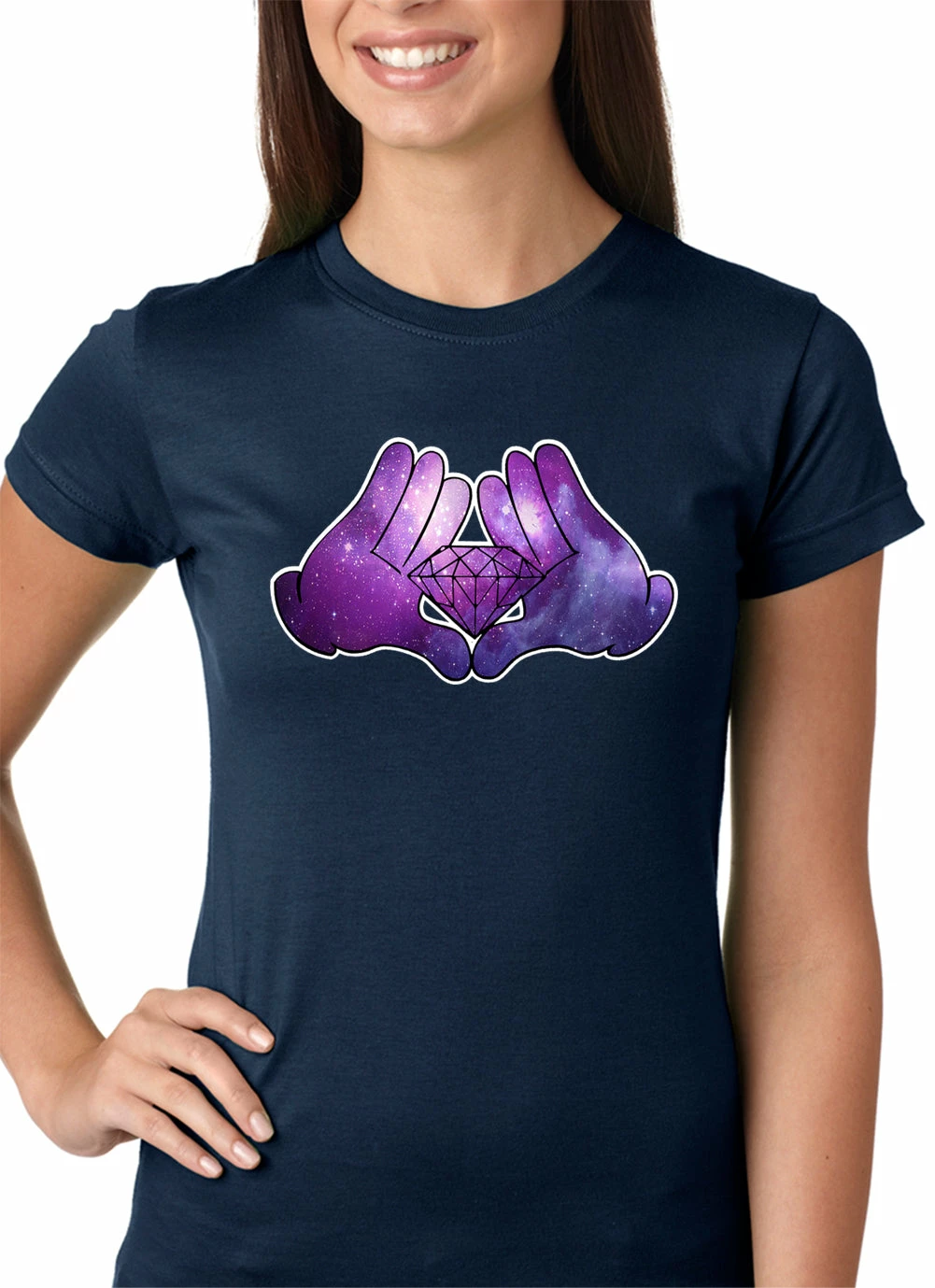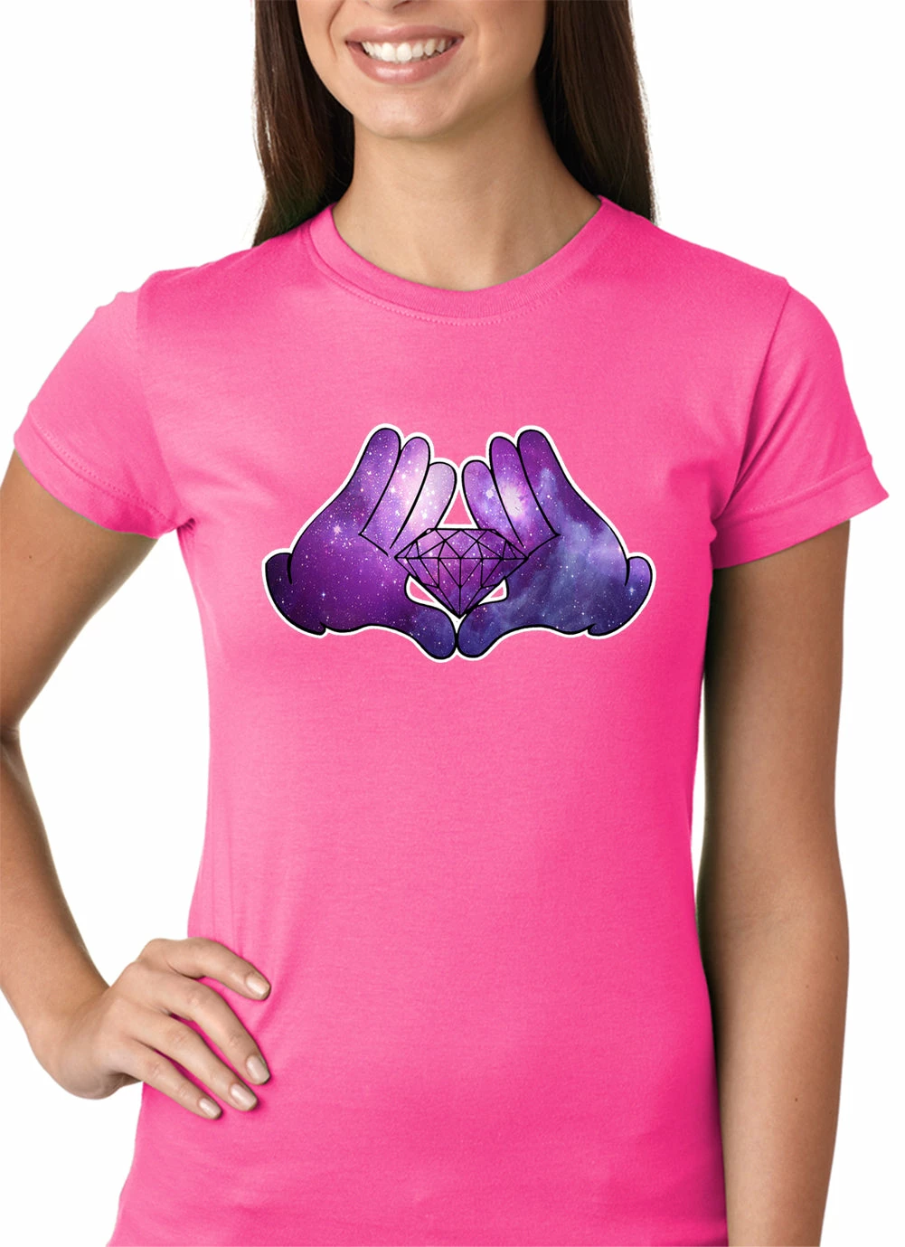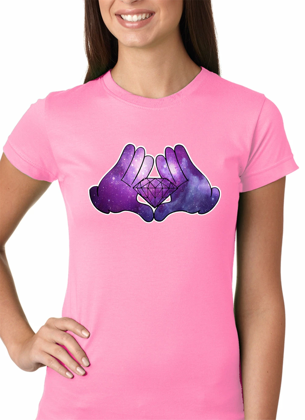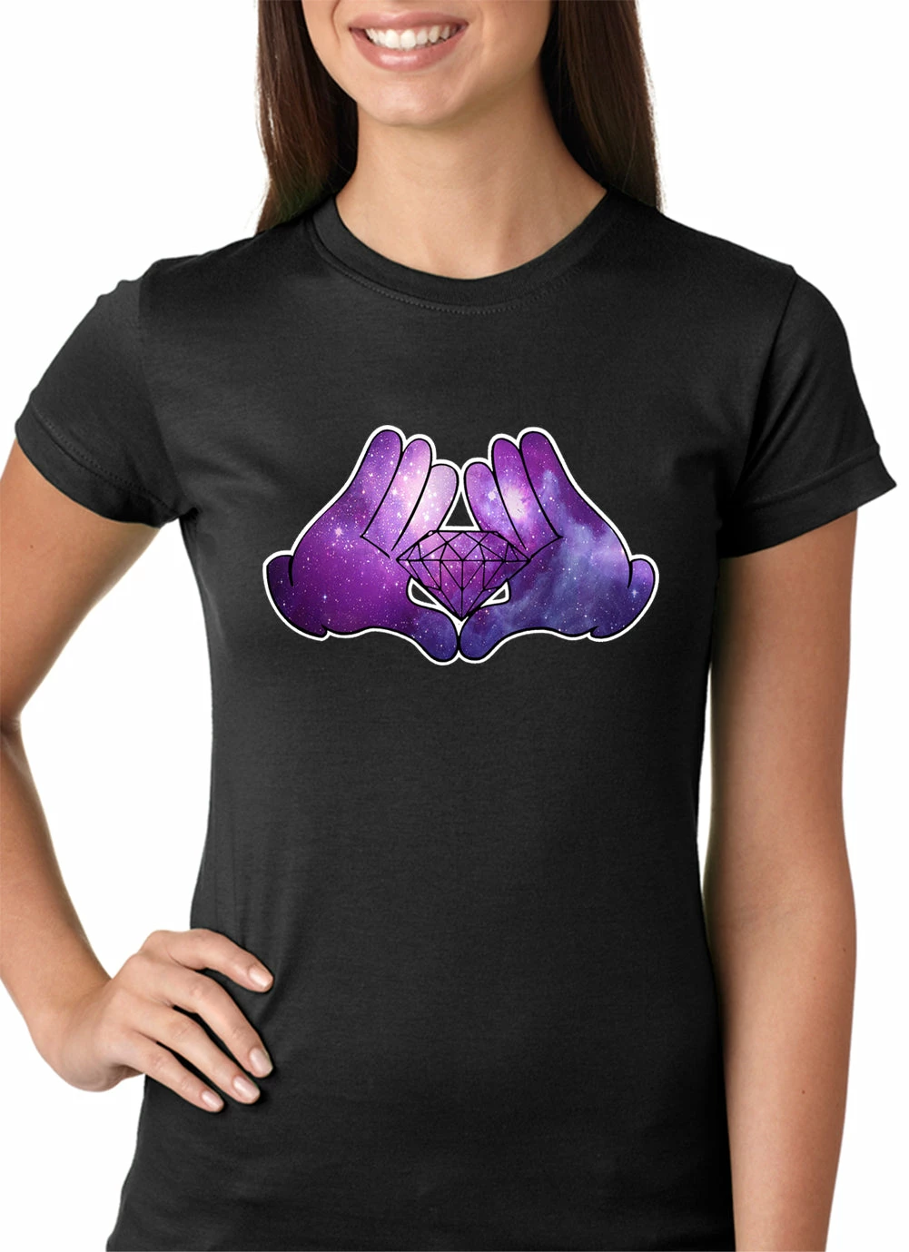 Cartoon Hands Diamond Cosmos Junior Fitted shirts are a S-32″ at bust and 29″ at waist, M-34″ at bust and 30″ at waist , L36″ at bust and 34″ at waist, XL-38″ at bust and 35″ at waist.