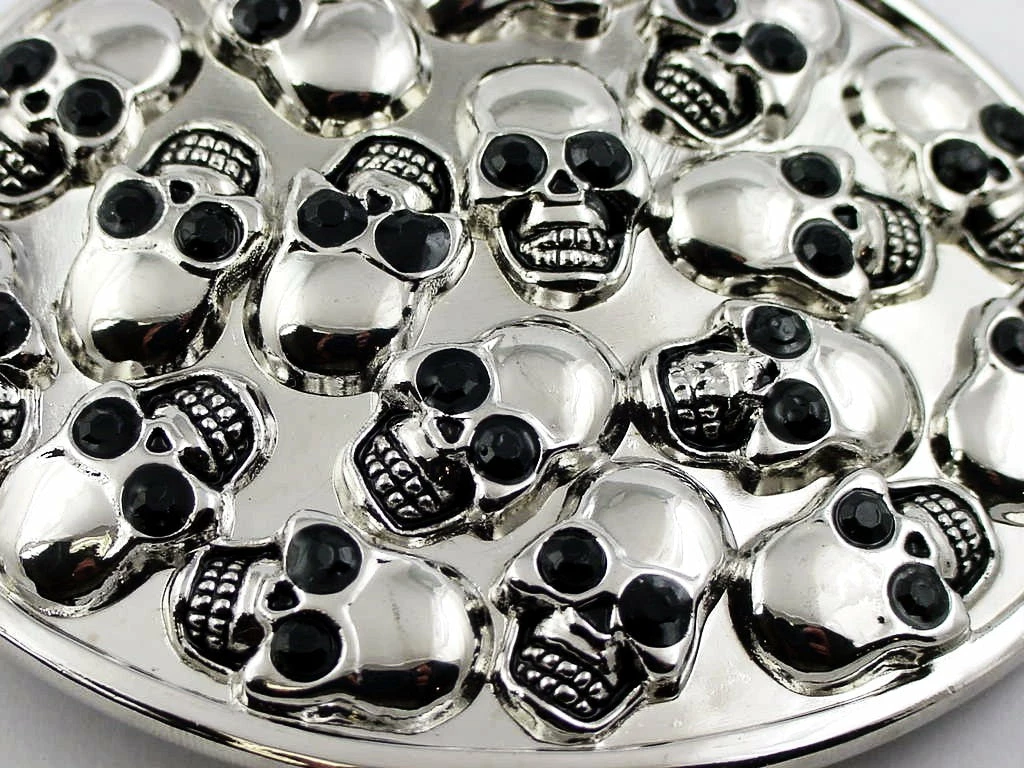 This unique skull pile buckle is finished in high polished chrome and all of the skulls have black stones for eyes. This beautifully crafted belt buckle will add an intricate touch to any outfit including jeans. Perfect for a guy or a girl, this buckle also makes a great gift. Fit most universal belts.
