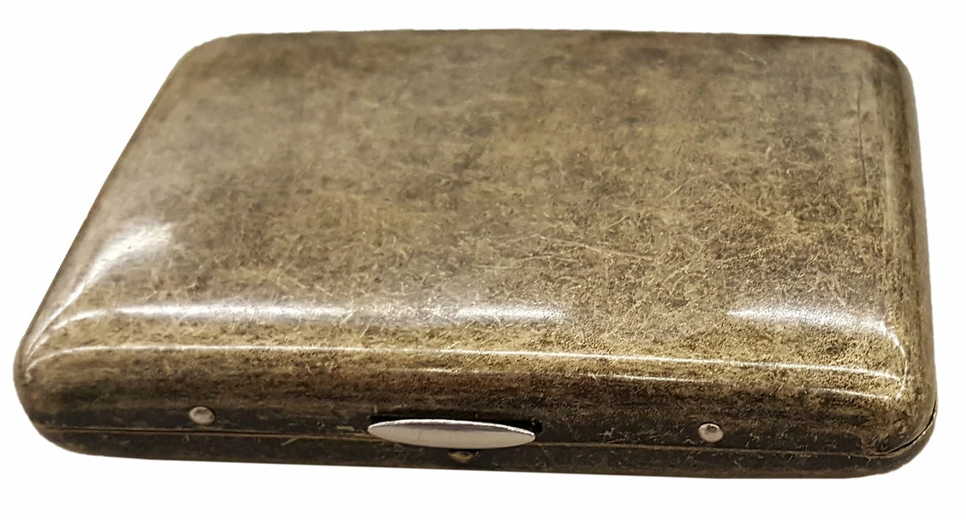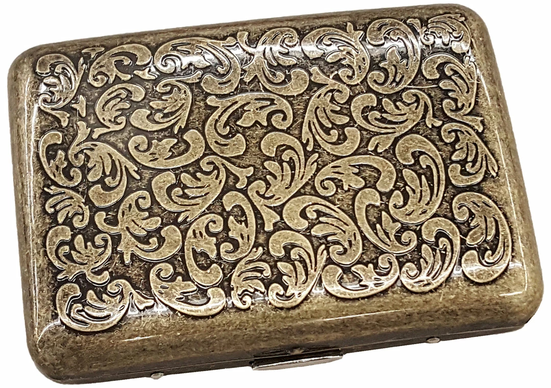 Cigarette Cases are always a classy way to hold on to your cigarettes and prevent them from getting crushed. Just flip the spring loaded lid open and retrieve your favorite cigarette. Our Antique Brass Paisley Cigarette Case can 16 king sized cigarettes. This case will fit king size cigarettes and measures 2 3/4″ W x 3 3/4″ H.