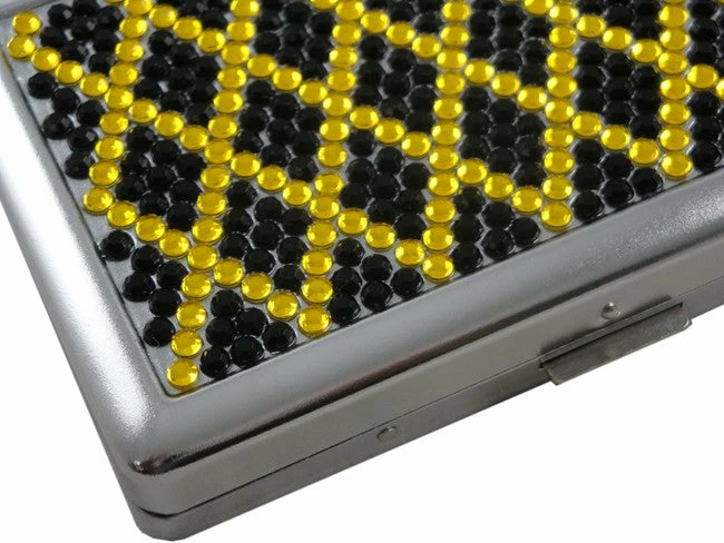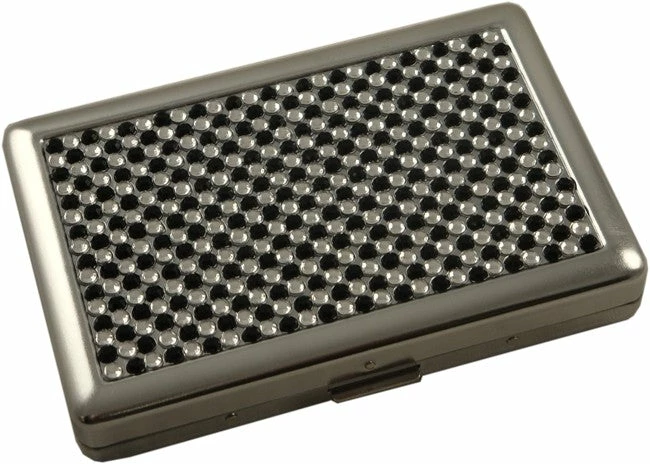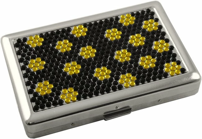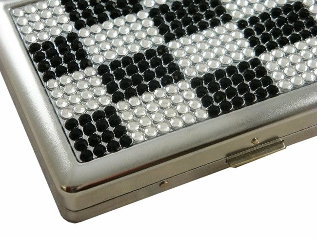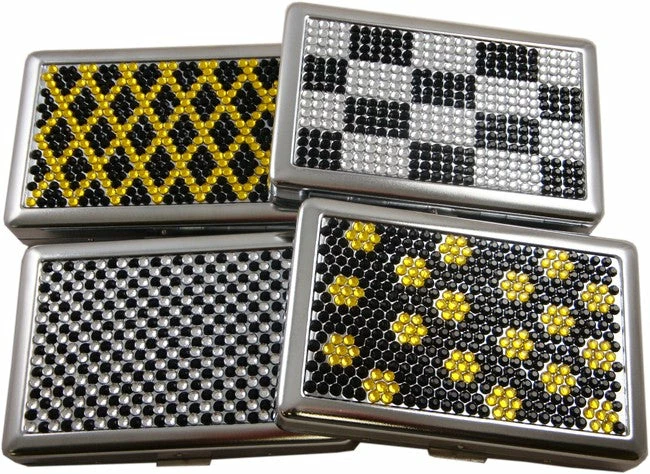 Deluxe Rhinestone Cigarette Case Collection. Our collection of deluxe rhinestone cigarette cases feature sleek chrome finish and brilliant rhinestone patterns embedded in to the front of the case. Available in your choice of color scheme, these case are a classy way to carry your cigarettes while keeping them fresh and protected. Each Deluxe Rhinestone Cigarette Case will hold up to 16 of your favorite regular king or 100’s sized cigarettes. Case measures 4″ x 2 3/4″ x 3/4″. Cases sold individually.