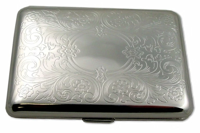 Cigarette Cases are always a classy way to hold on to your cigarettes and prevent them from getting crushed. Just flip the spring loaded lid open and retrieve your favorite cigarette. Our Victorian Paisley Cigarette Case can hold upto 14 of your favorite regular cigarettes. Brilliantly finished in polished chrome, this scribed cigarette case was inspired by the floral designs of the Victorian era in the 1860’s – 1890’s.