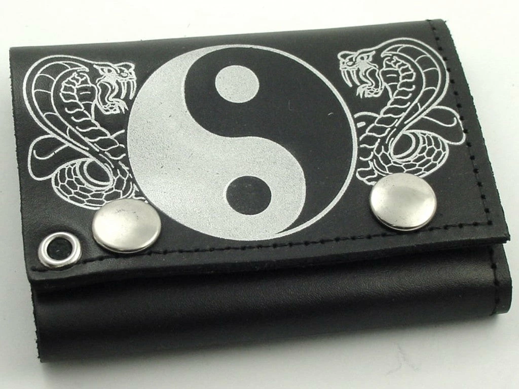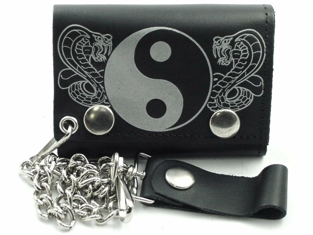 Cobra’s Ying Yang Genuine Leather Chain Wallet.Our Genuine Leather Chain Wallets Are made with you in mind, with all the compartments you need for all your valuables, money, credit cards ID cards and photos all in one great looking secure place. Made of 100% real leather these wallets are beefy and tough and of course look great! This Wallet comes complete with a removable 17” chrome chain that easily clips to a sturdy corner rivet on the wallet. To attach this chain wallet to you pants simply snap the leather button hoop to the front belt loop of your pants. This wallet is a great fashion statement but also secures your wallet and belongings safely to you making theft or loss of your wallet nearly impossible. the chain also features a loose clip that is perfect for attaching your keys keeping them safe and secure as well. The wallet itself features 4 separate compartments including 2 for your credit cards and IDs, one for pictures that holds 12 wallet sized photos and one over sized money compartment on the top that is big enough to hold any kind of international currency.
