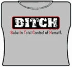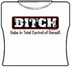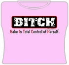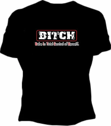 B.I.T.C.H. Girls T-Shirt. Exclusively from Bewild.com, these new tee’s feature hard-core sayings that say it all. From “Trust Me I’m A Doctor” to “Thats Mr. Asshole To You”. How about a t-shirt that says “I Scored High On My Drug Test” Our short sleeve t-shirts are made from a 100% fully machine washable cotton/poly blend for a cool and comfortable fit every time. On the front of this shirt it says “BITCH” and underneath it says “Babe In Total Control of Herself”