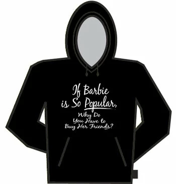 Barbie, Buy Her Friends, You will be able to picture yourself walking anywhere in this Black Hooded 50/50 Sweatshirt. Designed for warmth and durability the 7.5 ounce, 50/50 blend fleece fabric with double-ply hood provides protection from a blinding snow storm at the North Pole or from blowing sand in the Mojave Desert. This hooded sweat is versitility plus. The convenient pouch pocket keeps hands warm or holds a water bottle. The matching drawstring and metal grommets on the hood make sure it stays where it belongs. The set-in sleeves, ribbed cuffs and banded bottom all keep this shirt together in a way that makes durability its middle name.