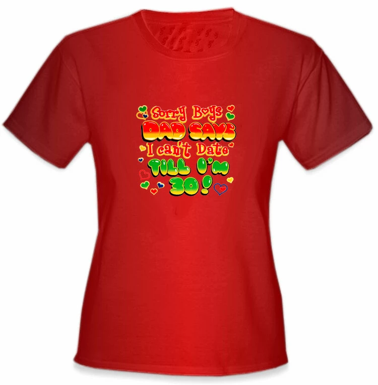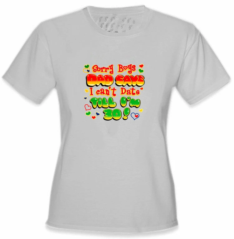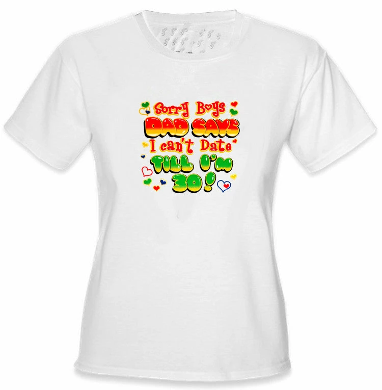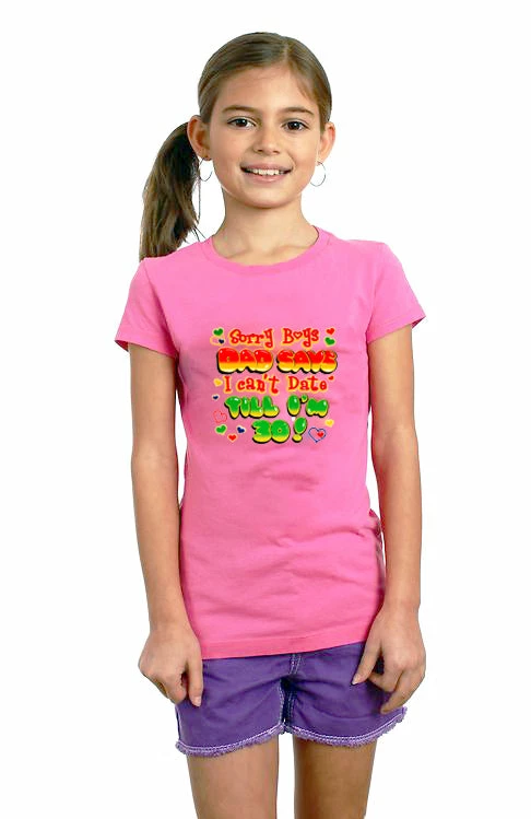 Each shirt is screen printed with the phrase, “Sorry Boys Dad Says I cant date till I’m 30!” Exclusively yours from Bewild.com. Great for gifts for your childs everyday use. This Print comes in a variety of colors to be worn by both young boys or girls. Get your child one today. 100 percent cotton.