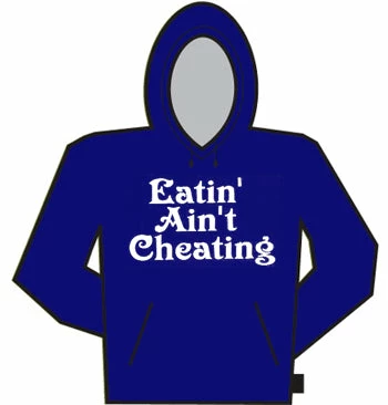 Eatin’ Ain’t Cheating Hoodie. You will be able to picture yourself walking anywhere in this Navy Hooded 50/50 Sweatshirt. Designed for warmth and durability the 7.5 ounce, 50/50 blend fleece fabric with double-ply hood provides protection from a blinding snow storm at the North Pole or from blowing sand in the Mojave Desert. This hooded sweat is versitility plus. The convenient pouch pocket keeps hands warm or holds a water bottle. The matching drawstring and metal grommets on the hood make sure it stays where it belongs. The set-in sleeves, ribbed cuffs and banded bottom all keep this shirt together in a way that makes durability its middle name.
