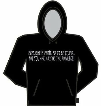 Everyone is entitled to be stupid but you are abusing the privilege, You will be able to picture yourself walking anywhere in this Black Hooded 50/50 Sweatshirt. Designed for warmth and durability the 7.5 ounce, 50/50 blend fleece fabric with double-ply hood provides protection from a blinding snow storm at the North Pole or from blowing sand in the Mojave Desert. This hooded sweat is versitility plus. The convenient pouch pocket keeps hands warm or holds a water bottle. The matching drawstring and metal grommets on the hood make sure it stays where it belongs. The set-in sleeves, ribbed cuffs and banded bottom all keep this shirt together in a way that makes durability its middle name.