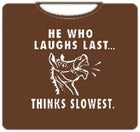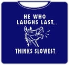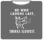 He Who Laughs Last T-Shirt. Exclusively from Bewild.com, these new tee’s feature hard-core sayings that say it all. From “Trust Me I’m A Doctor” to “Thats Mr. Asshole To You”. How about a t-shirt that says “I Scored High On My Drug Test” Our short sleeve t-shirts are made from a 100% fully machine washable cotton/poly blend for a cool and comfortable fit every time. On the front of this shirt it says “He Who Laughs Last… Thinks Slowest”