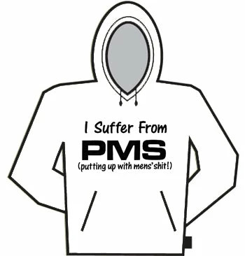 PMS (Putting Up With Mens Shit!), You will be able to picture yourself walking anywhere in this White Hooded 50/50 Sweatshirt. Designed for warmth and durability the 7.5 ounce, 50/50 blend fleece fabric with double-ply hood provides protection from a blinding snow storm at the North Pole or from blowing sand in the Mojave Desert. This hooded sweat is versitility plus. The convenient pouch pocket keeps hands warm or holds a water bottle. The matching drawstring and metal grommets on the hood make sure it stays where it belongs. The set-in sleeves, ribbed cuffs and banded bottom all keep this shirt together in a way that makes durability its middle name.