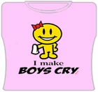 I Make Boys Cry Girls T-Shirt. Exclusively from Bewild.com, these new tee’s feature hard-core sayings that say it all. From “Trust Me I’m A Doctor” to “Thats Mr. Asshole To You”. How about a t-shirt that says “I Scored High On My Drug Test” Our short sleeve t-shirts are made from a 100% fully machine washable cotton/poly blend for a cool and comfortable fit every time. On the front of this shirt it says “I Make Boys Cry”.