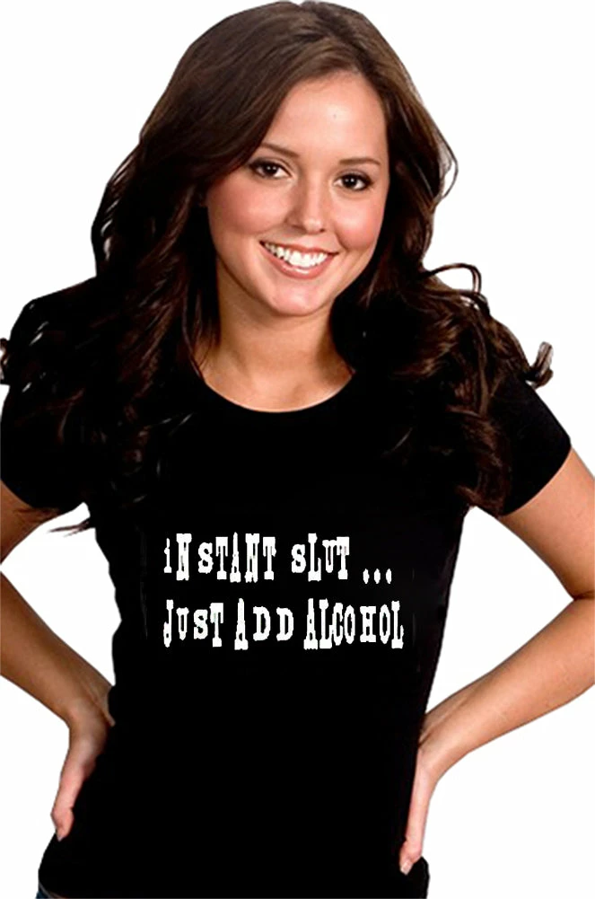 Instant Slut Girls T-Shirt. Exclusively from Bewild.com, these new tee’s feature hard-core sayings that say it all. From “Trust Me I’m A Doctor” to “Thats Mr. Asshole To You”. How about a t-shirt that says “I Scored High On My Drug Test” Our short sleeve t-shirts are made from a 100% fully machine washable cotton/poly blend for a cool and comfortable fit every time. On the front of this shirt it says “Instant Slut Just Add Alcohol”.