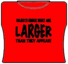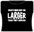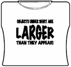 Larger Than They Appear Girls T-Shirt. Exclusively from Bewild.com, these new tee’s feature hard-core sayings that say it all. From “Trust Me I’m A Doctor” to “Thats Mr. Asshole To You”. How about a t-shirt that says “I Scored High On My Drug Test” Our short sleeve t-shirts are made from a 100% fully machine washable cotton/poly blend for a cool and comfortable fit every time. On the front of this shirt it says “Object Under Shirt ARe Larger Than They Appear”.