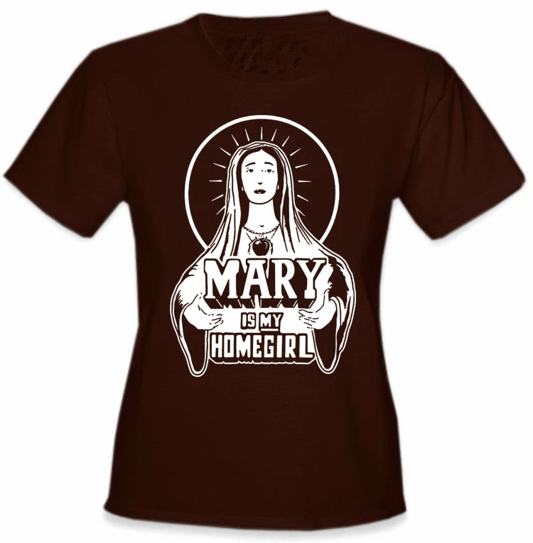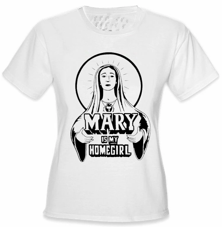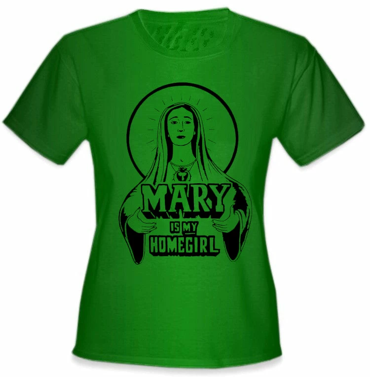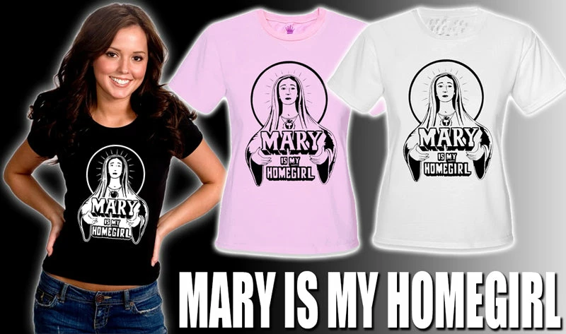 Mary Is My HomeGirl Girls T-Shirt. Say it loud, show your faith and earn a few smiles with this new “Mary is my homegirl” T-shirt. We have all seen the shirts that say Jesus is my homeboy, why should we leave out mother mary?! This shirt is a great faith driven statement that is cool and hip!