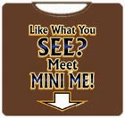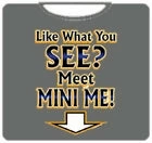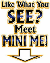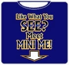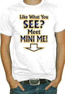 Meet Mini Me T-Shirt. Exclusively from Bewild.com, these new tee’s feature hard-core sayings that say it all. From “Trust Me I’m A Doctor” to “Thats Mr. Asshole To You”. How about a t-shirt that says “I Scored High On My Drug Test” Our short sleeve t-shirts are made from a 100% fully machine washable cotton/poly blend for a cool and comfortable fit every time. On the front of this shirt it says “Like What You See Meet Mini Me!” with an arrow pointing down.