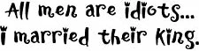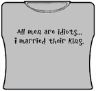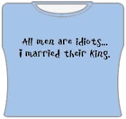 Men Are Idiots Girls T-Shirt. Exclusively from Bewild.com, these new tee’s feature hard-core sayings that say it all. From “Trust Me I’m A Doctor” to “Thats Mr. Asshole To You”. How about a t-shirt that says “I Scored High On My Drug Test” Our short sleeve t-shirts are made from a 100% fully machine washable cotton/poly blend for a cool and comfortable fit every time. On the front of this shirt it says “All Men Are Idiots, I Married Their King!”.