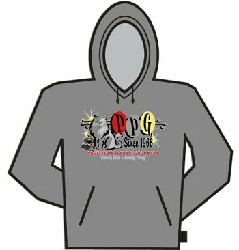 PPG (Professional P*ssy Groomers) Since 1966 Hoodie. You will be able to picture yourself walking anywhere in this Grey Hooded 50/50 Sweatshirt. Designed for warmth and durability the 7.5 ounce, 50/50 blend fleece fabric with double-ply hood provides protection from a blinding snow storm at the North Pole or from blowing sand in the Mojave Desert. This hooded sweat is versitility plus. The convenient pouch pocket keeps hands warm or holds a water bottle. The matching drawstring and metal grommets on the hood make sure it stays where it belongs. The set-in sleeves, ribbed cuffs and banded bottom all keep this shirt together in a way that makes durability its middle name.