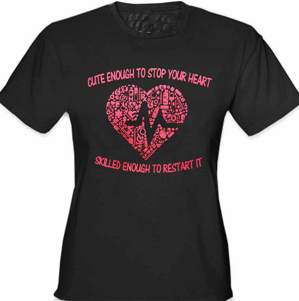 Cute Enough To Stop Your Heart Junior Fitted shirts are a S-32″ at bust and 29″ at waist, M-34″ at bust and 30″ at waist , L36″ at bust and 34″ at waist, XL-38″ at bust and 35″ at waist.