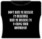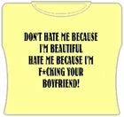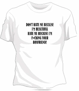 Don’t Hate Me Girls T-Shirt. Exclusively from Bewild.com, these new tee’s feature hard-core sayings that say it all. From “Trust Me I’m A Doctor” to “Thats Mr. Asshole To You”. How about a t-shirt that says “I Scored High On My Drug Test” Our short sleeve t-shirts are made from a 100% fully machine washable cotton/poly blend for a cool and comfortable fit every time. On the front of this shirt it says “Don’t Hate Me Cause I’m Beautiful Hate Me Cause I’m Fuckin Your Boyfriend”.