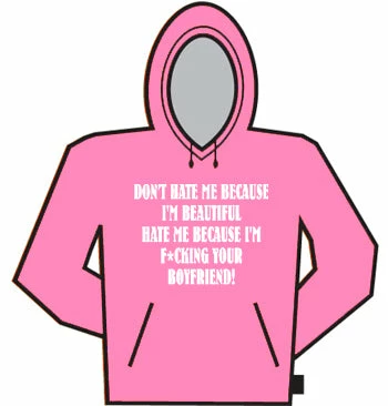 Don’t Hate Me Cause I’m Beautiful Hate Me Cause I’m Fuckin Your Boyfriend, You will be able to picture yourself walking anywhere in this Pink Hooded 50/50 Sweatshirt. Designed for warmth and durability the 7.5 ounce, 50/50 blend fleece fabric with double-ply hood provides protection from a blinding snow storm at the North Pole or from blowing sand in the Mojave Desert. This hooded sweat is versitility plus. The convenient pouch pocket keeps hands warm or holds a water bottle. The matching drawstring and metal grommets on the hood make sure it stays where it belongs. The set-in sleeves, ribbed cuffs and banded bottom all keep this shirt together in a way that makes durability its middle name.